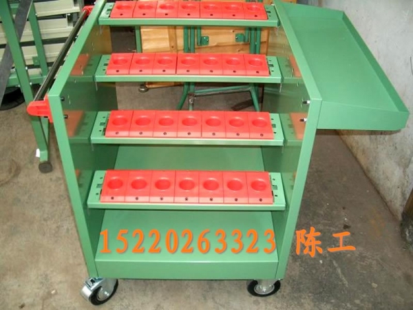CNC刀具儲(chǔ)運(yùn)器具(刀具車、刀具架、刀具柜、刀具套、刀具盤、刀具座) 1、刀具車、架、柜是專門用于數(shù)控車床、加工中心所用刀具、量具、工具的存放和運(yùn)輸。 2、刀具車和刀具架上的掛架,采用異型鋁合金型材,美觀、耐用。 3、各種規(guī)格的刀具盒均采用ABS工程塑料,盒上有懸掛定位溝槽,承載性能好,取用方便而且安全可靠。 4、刀具車和移動(dòng)刀具柜均采用#100的優(yōu)質(zhì)腳輪,耐油、耐磨、不傷地面,承載能力強(qiáng),后帶剎車。 5、顏色可根據(jù)用戶要求,尺寸可訂制。